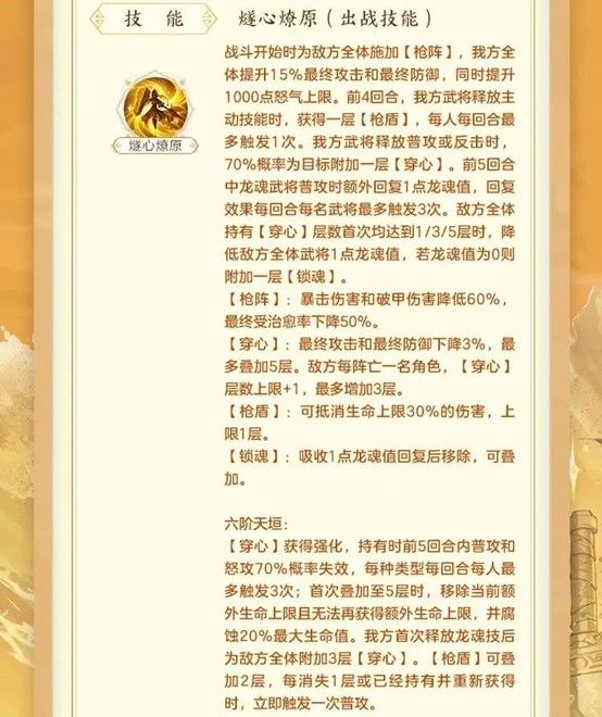 枪灵的核心机制是搭配了非常适配依赖普攻队伍的体系,我方武将不仅能通过普攻反击叠加穿心不断削弱对方的攻防,还能通过普攻回复龙魂值,保障魂技有充足的来源,更重要的是还能通过叠加穿心实现控制对方龙魂值的效果,附带的“锁魂”机制也让控魂效果不用担心被无效化,即使对方没有龙魂也能储存控魂效果。