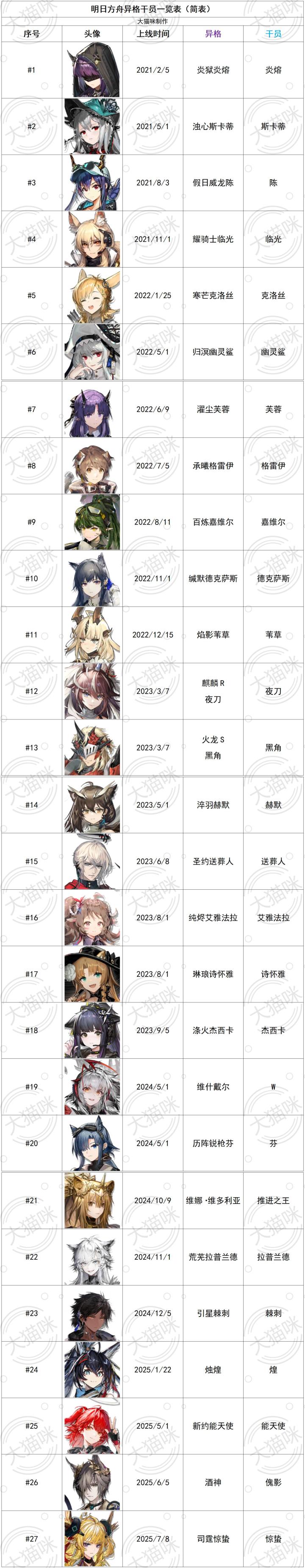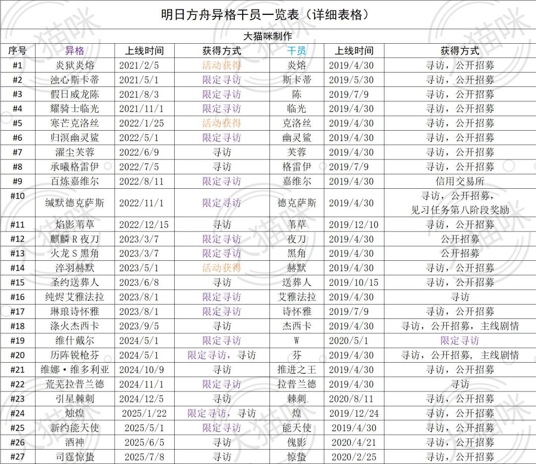 异格干员统计一览表(25/7/8更新)