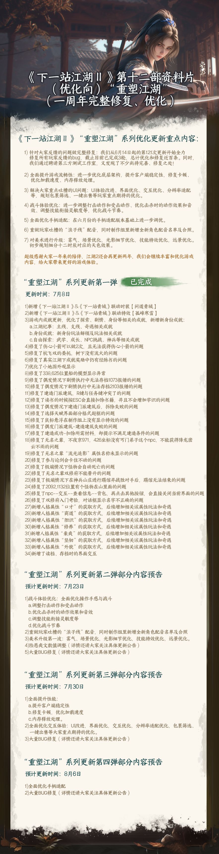 七月份,我们临时插入第十二部(优化向)资料片“重塑江湖”:对大家吐槽已久的诸多BUG、卡顿进行全面修复: