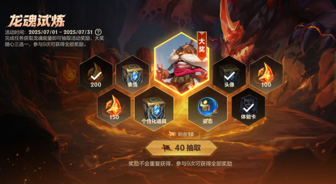 龙魂试炼阶段二火热进行中!截止至7月31日,召唤师完成对应阶段任务,即可实现海牛骑手 库奇、龙魂水晶*3000和专属大奖随心三选一。