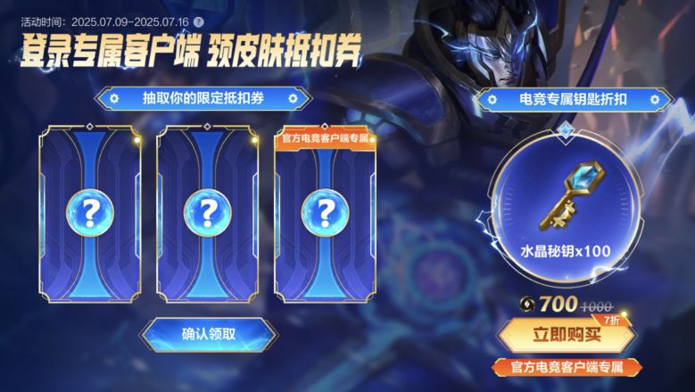 即日起至7月16日,召唤师登录专属客户端,即可领取限定皮肤抵扣券,还可享受电竞专属水晶秘钥折扣!