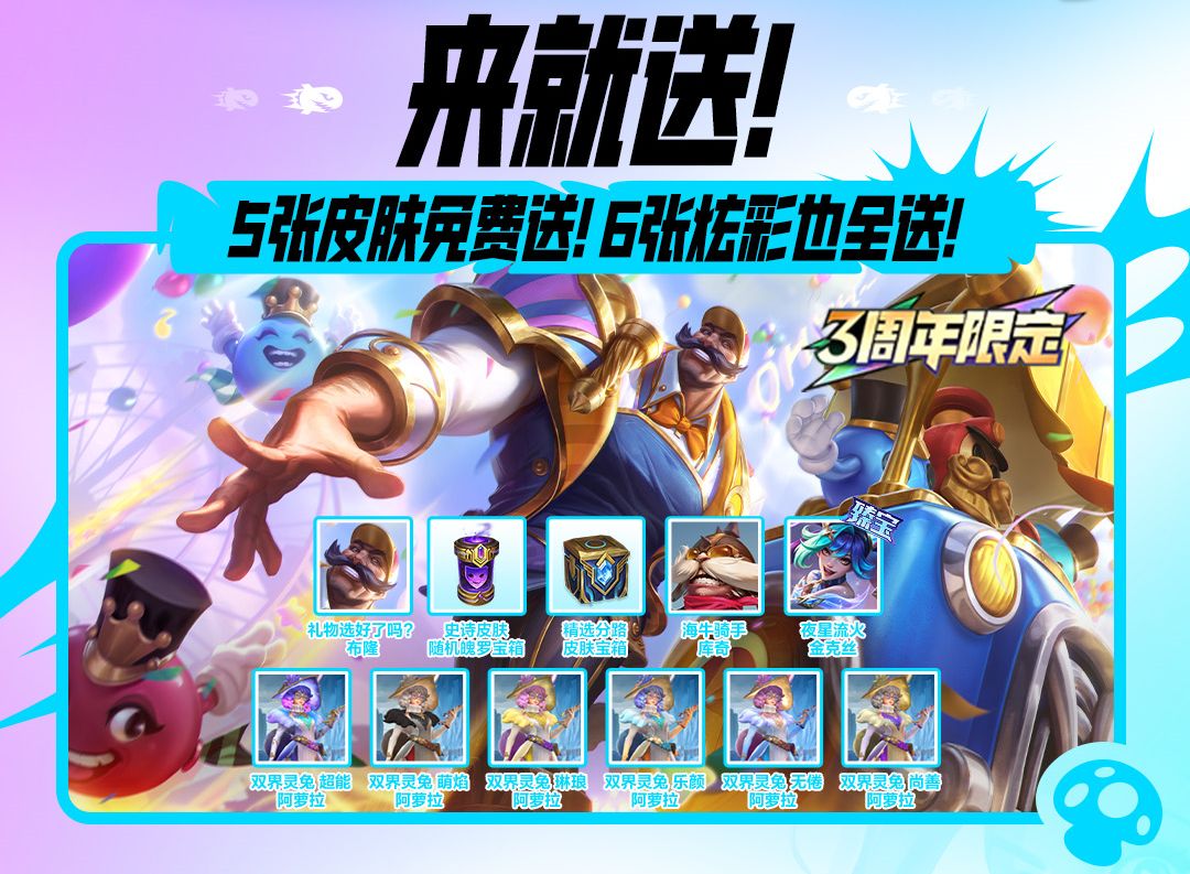 3周年限定皮肤-礼物选好了吗?布隆、精选分路皮肤宝箱等5款皮肤+6款阿萝拉炫彩皮肤免费领,限定皮肤轻松收入囊中,心动不如行动!