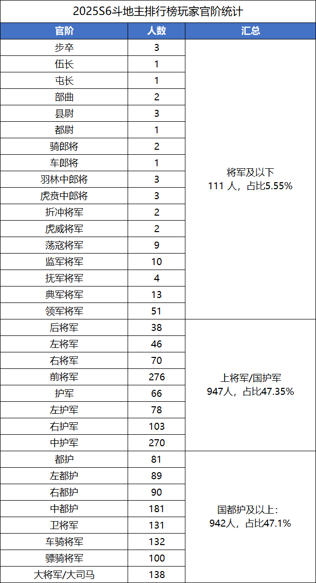 OL斗地主环境经过多次变迁,早期的活跃高玩玩家,我所知道的很多都不玩了。当然,有人老去,但总有人年轻。每个赛季的榜前玩家也都不断更迭。排行榜的玩家打得最多,他们无疑代表了当前的斗地主环境。来看看S6赛季排行榜积分靠前的2000名玩家官阶分布: