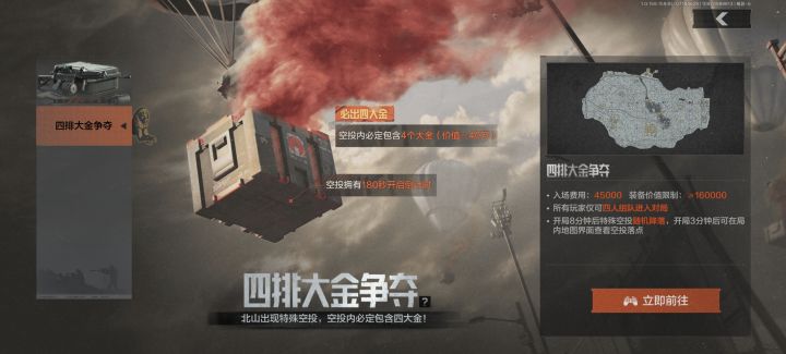 - 地图与空投:活动在北山地图进行。开局3分钟后,战术地图会显示特殊空投降落地点,开局8分钟时空投降落。开启空投需等待180秒,空投内必定包含四个大金,每个价值均≥40万柯恩币。