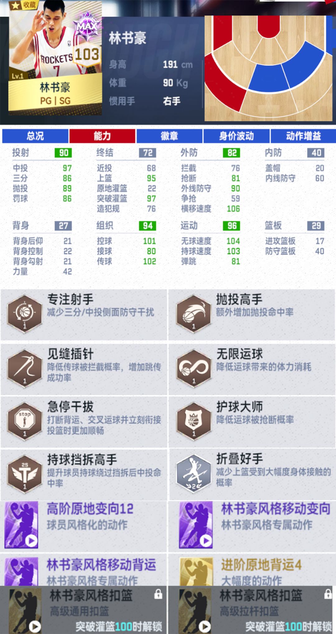 首先来看看面板,比较可惜的是三分满突满级96,没有开增益,但这也比新韦德和幼詹要好。上篮105+突扣107,还不错。抢断+拦截过线了,外防100+横移116,这个防守基本在后卫里属于T1级别了,横移紫了。无球114+持球113,算是T1级别了。内防70,这甚至要比历史林书豪的内防多5点。