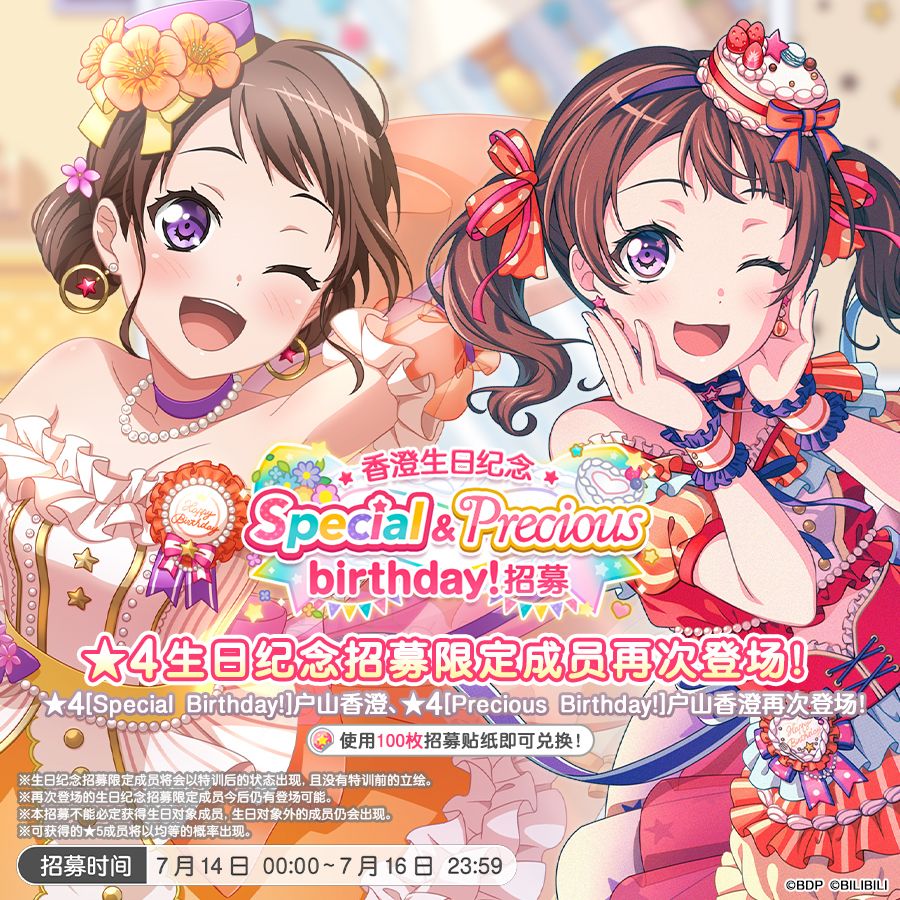 明日起,游戏内将限时开放「香澄生日纪念 Special&Precious birthday!招募」!过往登场过的生日纪念限定成员「★4户山香澄[Special birthday!]、★4户山香澄[Precious birthday!]」在本招募中再次登场!