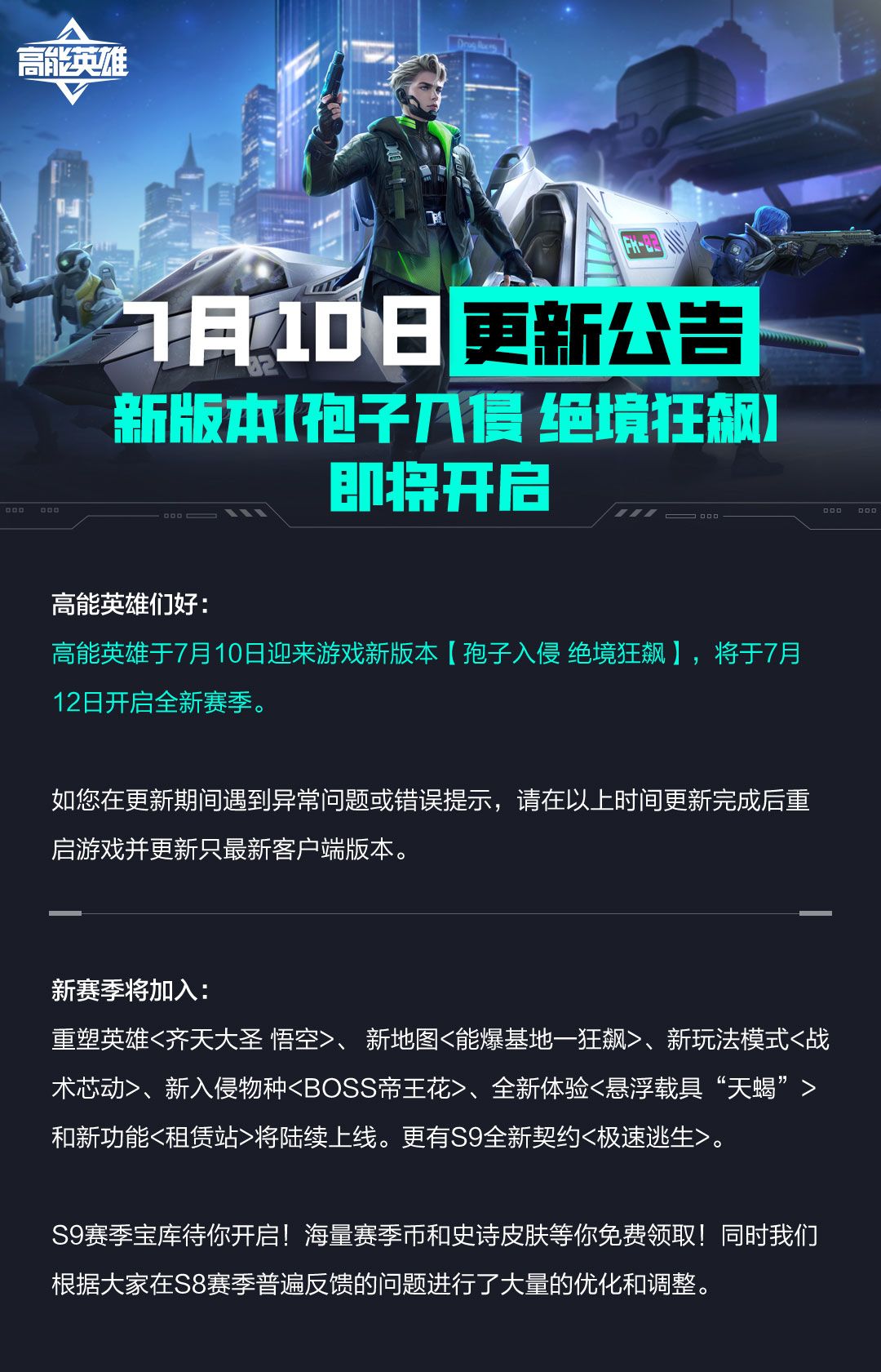 为了给大家带来更好的游戏体验,我们于7月10日发布《高能英雄》S9版本:孢子入侵,绝境狂飙。重塑英雄【齐天大圣 悟空】、新地图【能爆基地 狂飙】、新玩法模式【战术芯动】、新入侵物种【Boss帝王花】、全新体验【悬浮载具“天蝎”】和新功能【租赁站】将陆续上线。更有S9全新契约【极速逃生】和S9赛季宝库待你开启!海量赛季币和史诗皮肤等你免费领取!同时我们根据大家在S8赛季普遍反馈的问题进行了大量的优化和调整,敬请体验!以下是S9更新具体内容,请您查收!