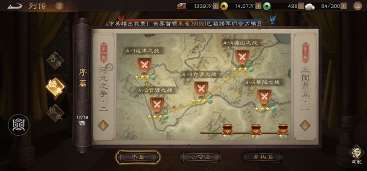 第二遍目标完成小成就,曹操跟二袁对话不难,找机会贴贴就行了,消灭三个谋士的小成就需要规划一下行为,开局大部队向第一个城池进攻,把郭图和袁谭放走就行,杀光小兵,跟在这俩人后面慢慢推进,我打第一遍的时候开局就把袁谭和郭图杀了,导致无人去请援军,审配就自始至终不会出现在现场上,小成就就完不成了,所以要放他们去求援,第一批援军到达后选继续进攻,清小兵,注意审配是作为第二批援军在13回合会出现在敌军后方,所以在审配出现干掉他之前别让二袁死于不明aoe了,二袁死则直接过关,最起码留一个袁,审配援军出现过在次选择继续进攻,第二遍为了完成小成就所以不用顾忌回合花了多少,足够用,曹操对话二袁加上消灭三谋士后,就可以直接秒了主将过关,获得三星加全部小成就~!