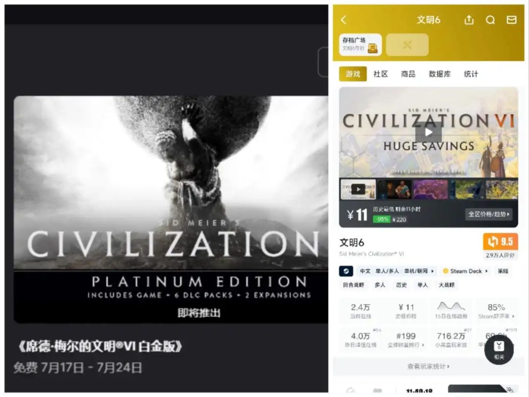 在这次夏促《文明6》再次史低,EPIC在7月17日也将在“喜加一”送出白金版。