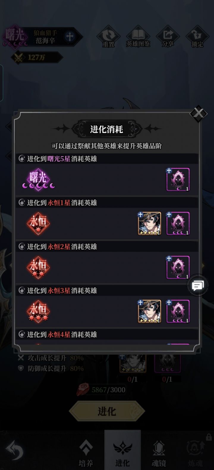 英雄点“进化”,左上角消耗,就可以看升星要求对应的狗狼。