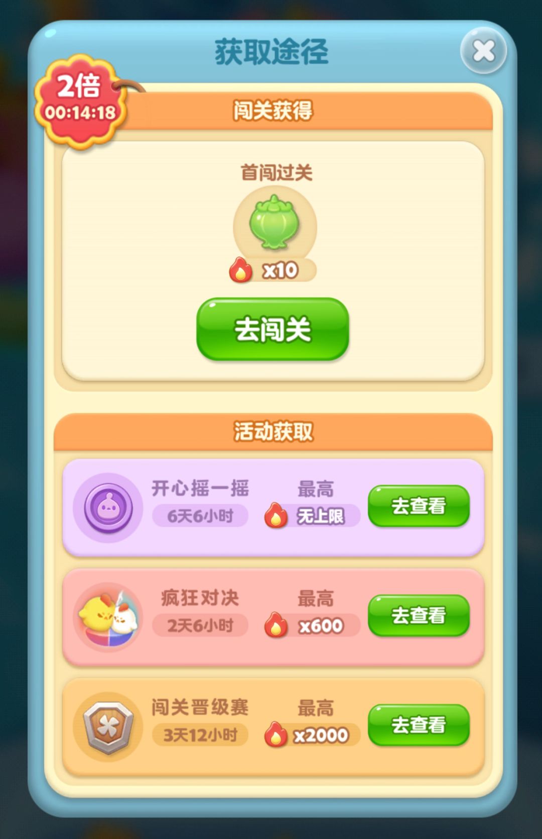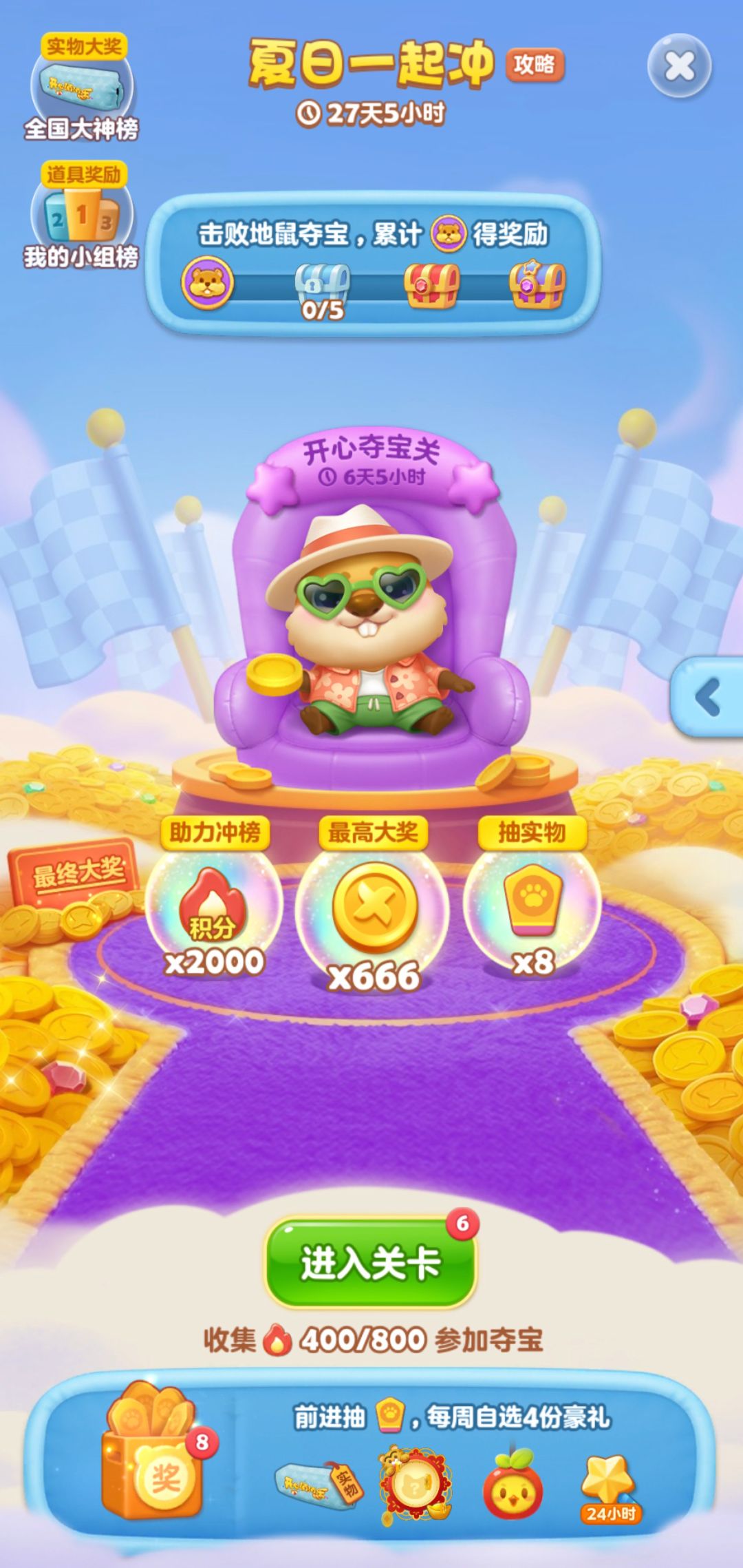 当抵达本周最高点后,将解锁本周的开心夺宝关,通过收集火苗获得夺宝关挑战机会。