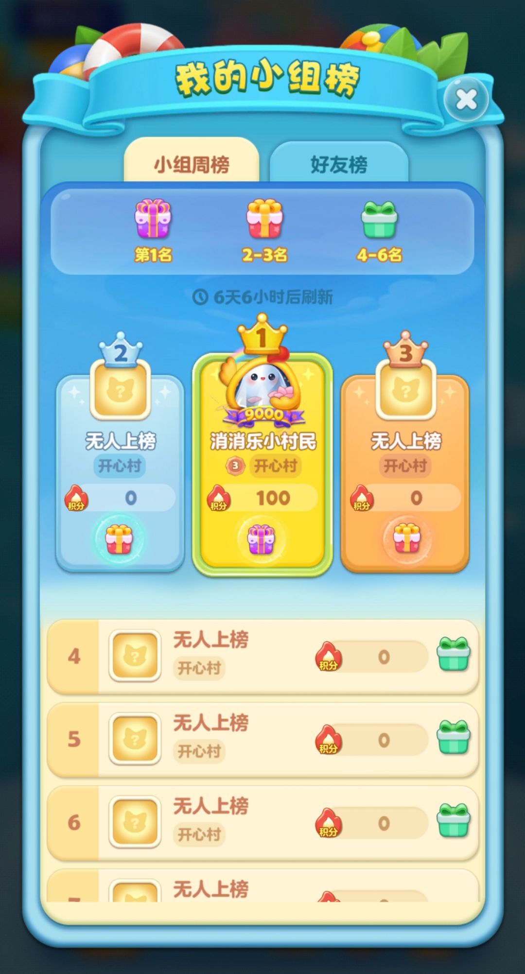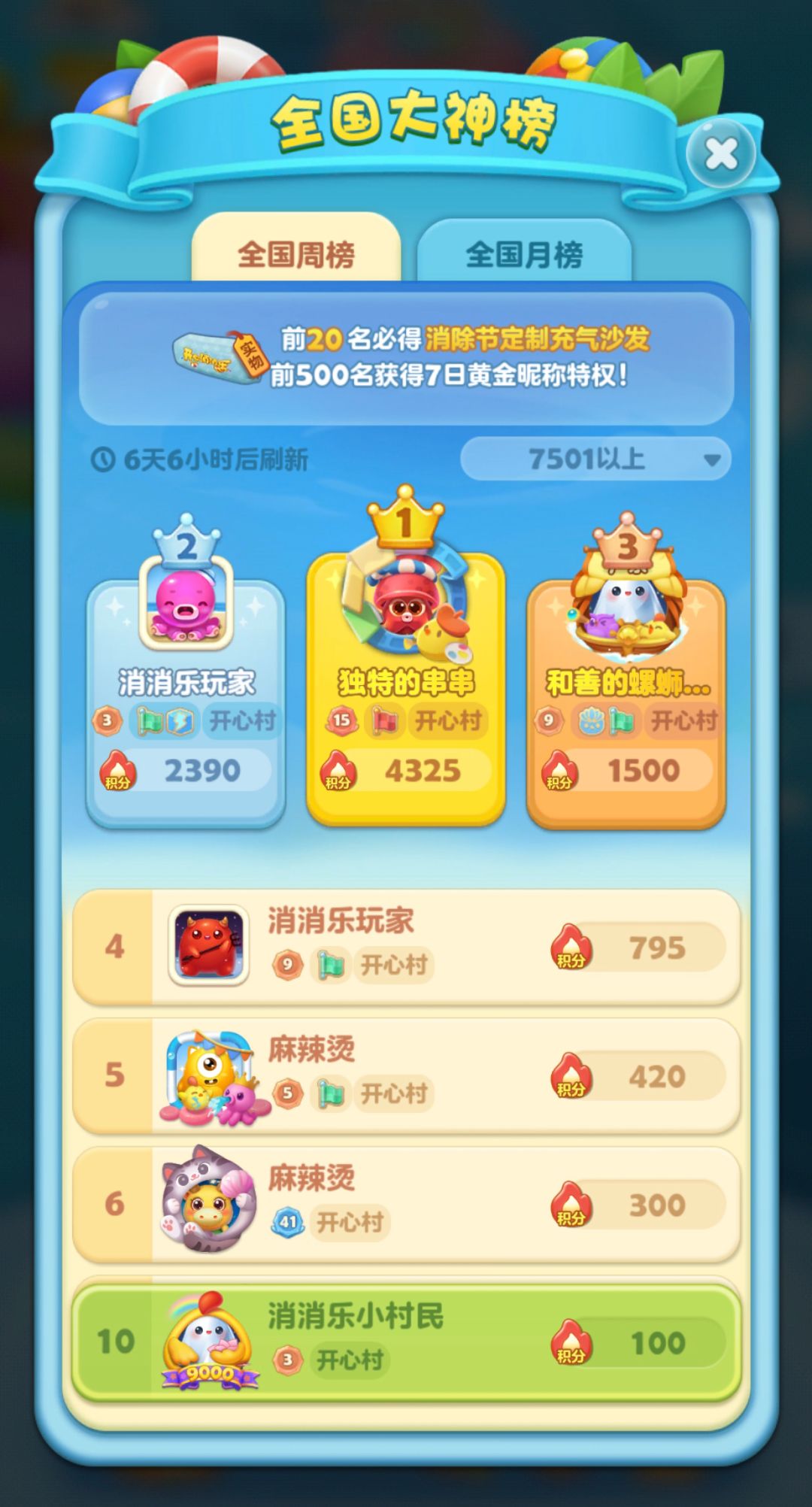● 小组周榜前三名将获得:助力闯关大礼包(无限精力、前置加分buff、前置魔力鸟、闯关道具等)