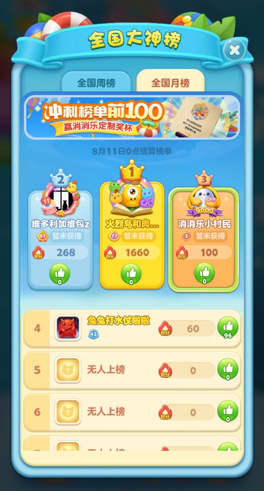 ● 全国月榜前100名将获得:2025消除节月榜纪念奖杯