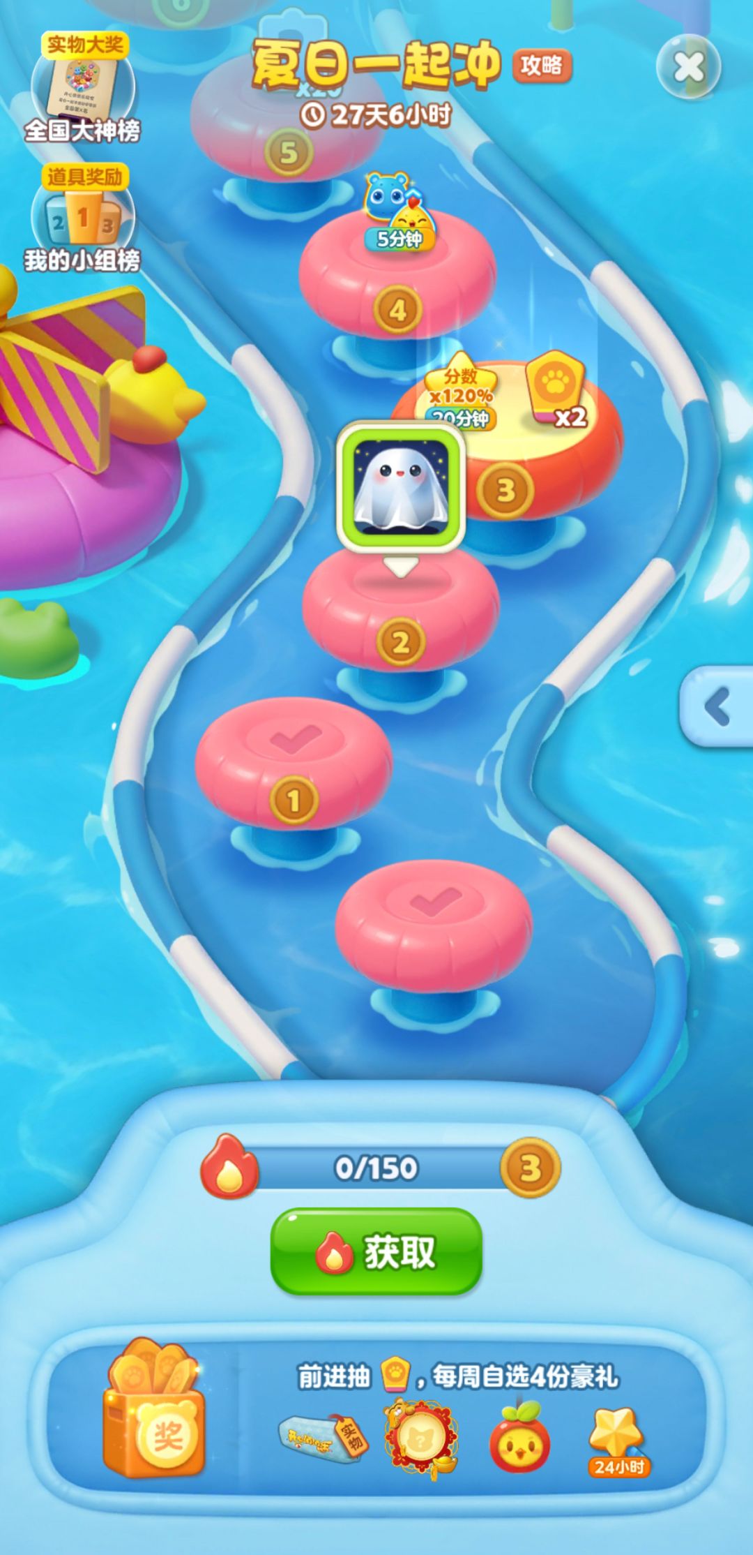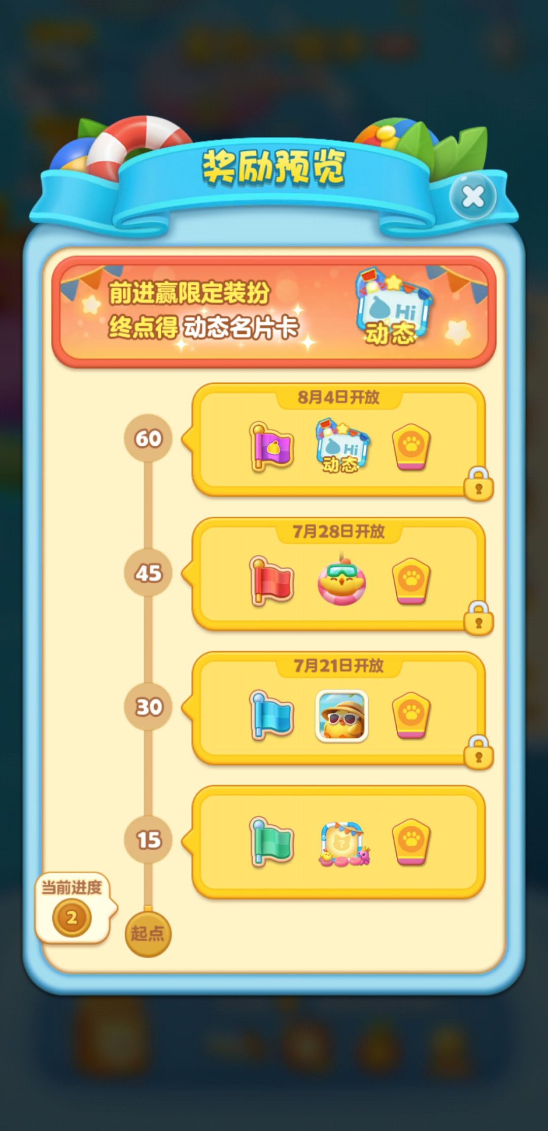 活动期间每周将解锁15个节点,总计60个节点,抵达新节点都会有闯关道具、幸运签、夏日主题装扮等丰富奖励,等待大家赢取