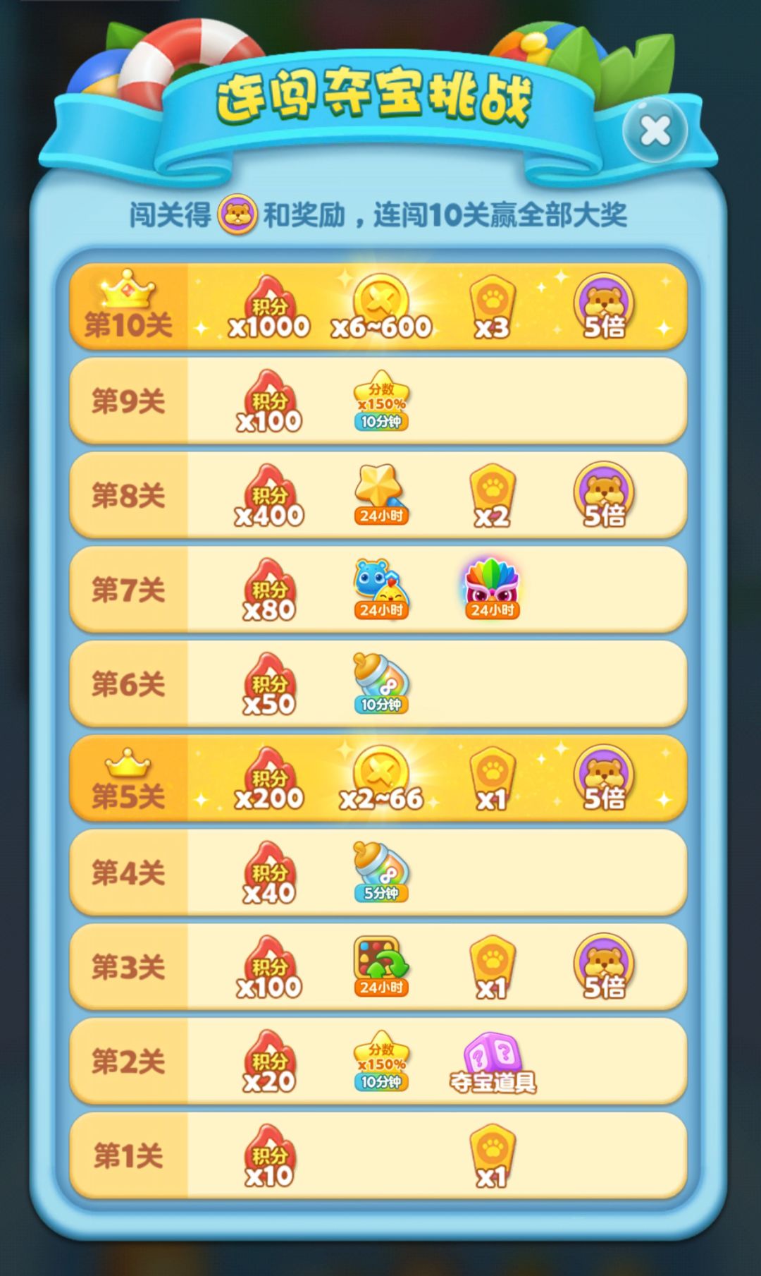 夺宝关每次挑战最多可连闯10关,每关都有丰厚奖励且奖励将逐渐增多,其中成功通过第5关可抽最多66风车币,通过第10关可抽最多600风车币,总计最多666风车币等你赢取,累计夺宝积分还可获得进度奖励~