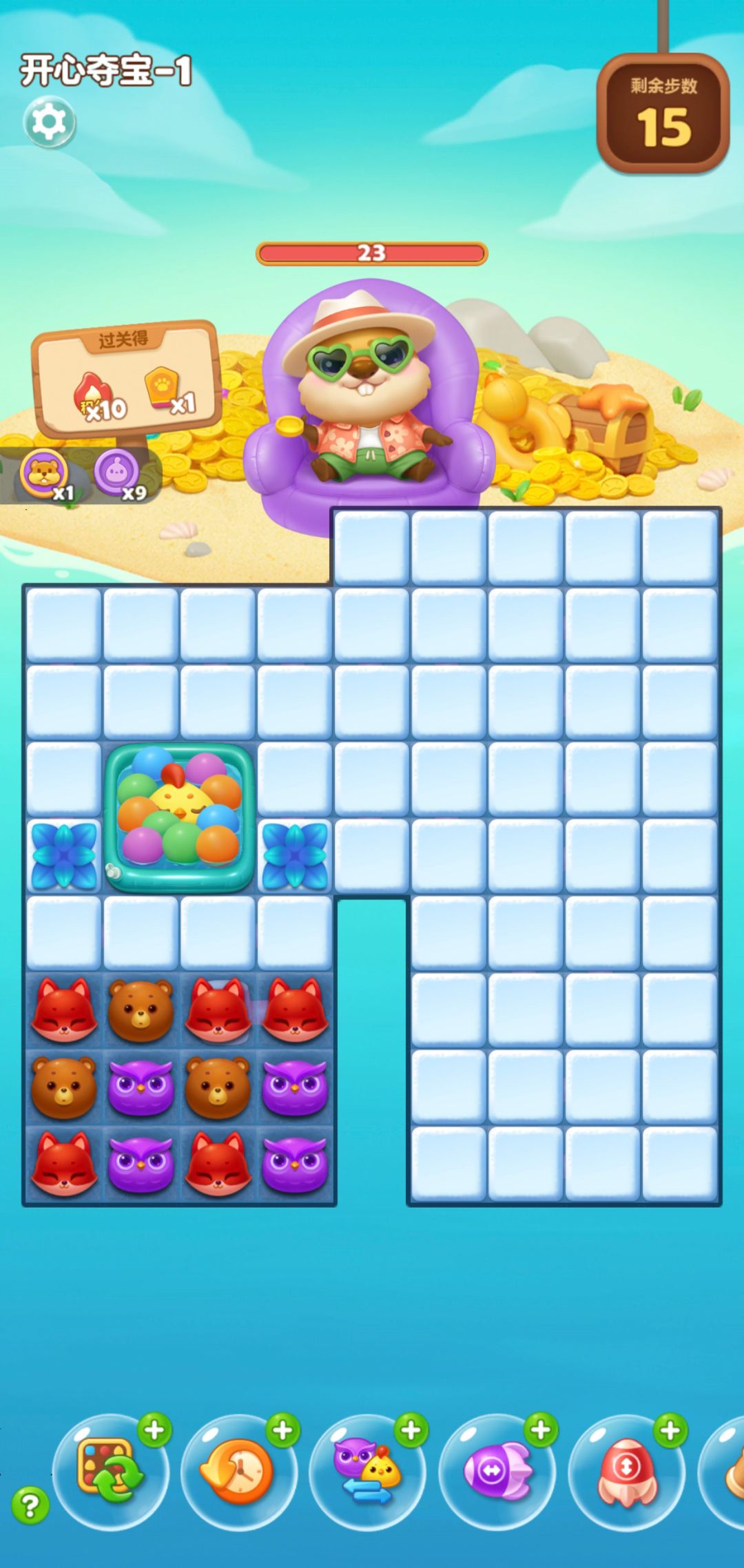 关卡内小村民通过收集冰块之下的锤子可攻击地鼠boss,过程中莱萌鸡将以两种形态参与其中,带来超强特效帮助消除,当集齐棋盘内所有锤子后,便能击败地鼠boss成功过关。