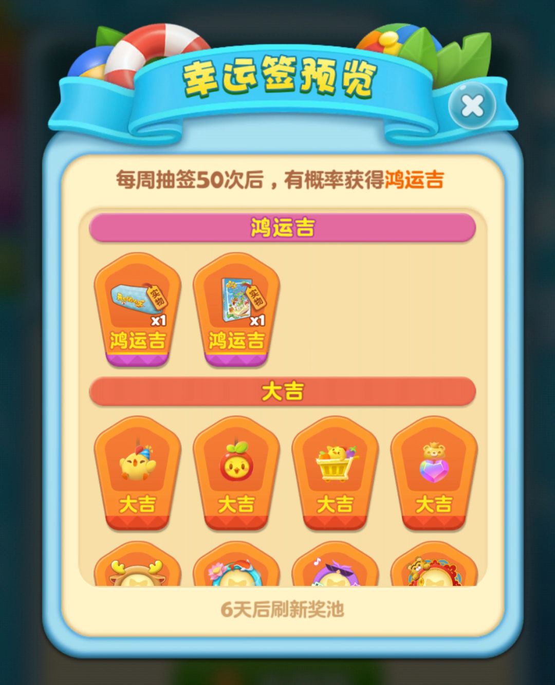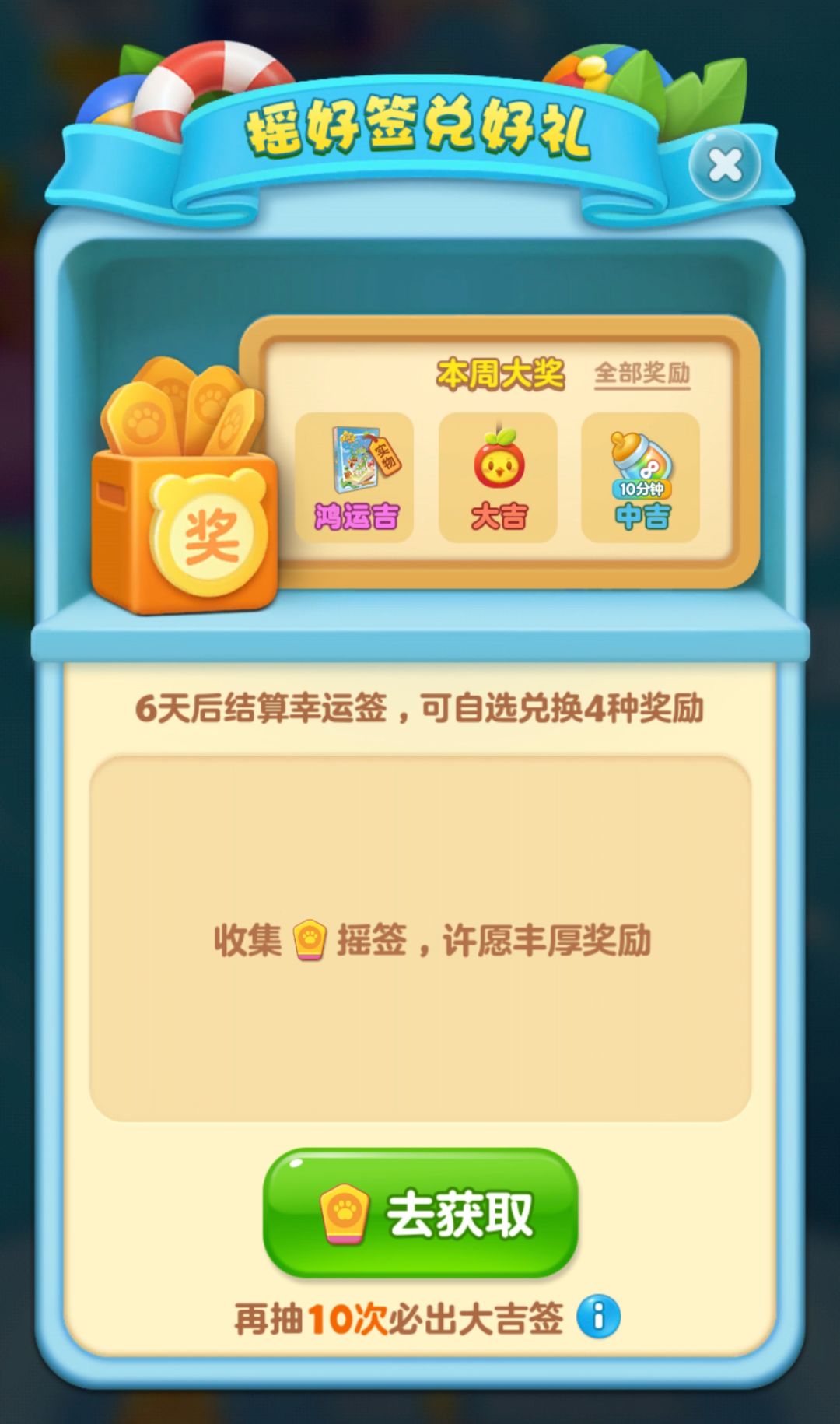 当幸运签抽数为10的倍数时,必定抽出大吉签及以上结果;而当本周累计抽签次数达到50次以上时,将有概率抽出鸿运吉签赢取实物周边奖励,开心村每周都将有50位幸运锦鲤小村民中签,让我们一起期待好运降临吧!