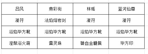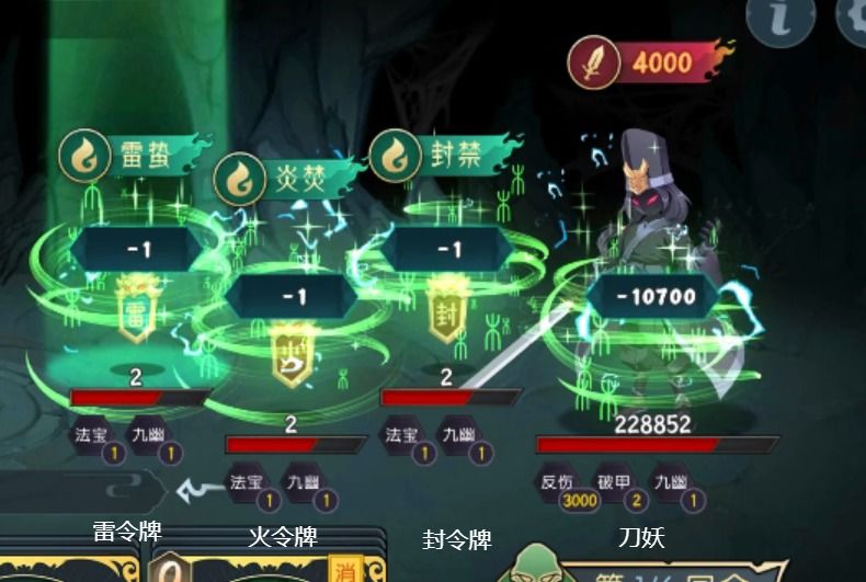 第四回合:这回合不吃剑海丹,可以吃蓄力或者血丹,柳盈打出玄冰神破和玄冰九变,甄巧巧打出战魂咒和焚元蓄力决,吕风复制焚元蓄力决并打出,林瑶打出燎原决,如果战意决在上方,打出,柳盈打出冰刃击杀刀妖和雷、封令牌,保留火令牌2滴血。如果感觉后面伤害不够可以把吕风的玄天战意符打出,不过一般是够的。