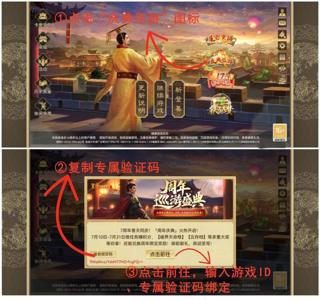 前往公众号参与,微信搜索“皇帝成长计划2”公众号并关注,底部菜单选择“周年活动-巡游盛典”,或发送关键字“巡游盛典”,即可前往参与