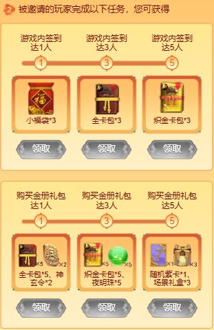 1、銮驾同行大人可通过邀请码邀请其他玩家并绑定,邀请人数不限(但每人只能绑定他人一次),被邀请的玩家在游戏内签到、或购买【御赐金册礼包】人数达到以下条件,您可获得以下奖励: