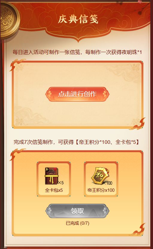 每日进入活动,大人可选用素材DIY一次庆典信笺,制作完成后每保存并分享一次,可获得【夜明珠*1】。完成7次信笺制作,可获得【帝王积分*100、全卡包*5】(仅限一次哦)。