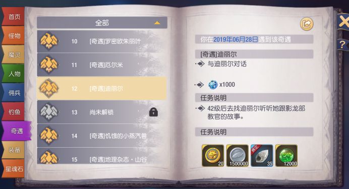 注意事项:迪丽尔自身是有支线任务-记忆水晶,经过多次测试,当玩家未开始完成记忆水晶这个支线任务时,直接点击迪丽尔不接受任务,一般切换五次左右地图该奇遇即可触发(运气不好十次左右)。但当玩家完成记忆水晶这个支线任务后,触发概率大大降低。所以一定要注意45级后,先完成该奇遇任务,再做记忆水晶这个支线任务。(42级后对话迪丽尔能触发奇遇12,原理一样,记忆水晶的支线任务先不要做)