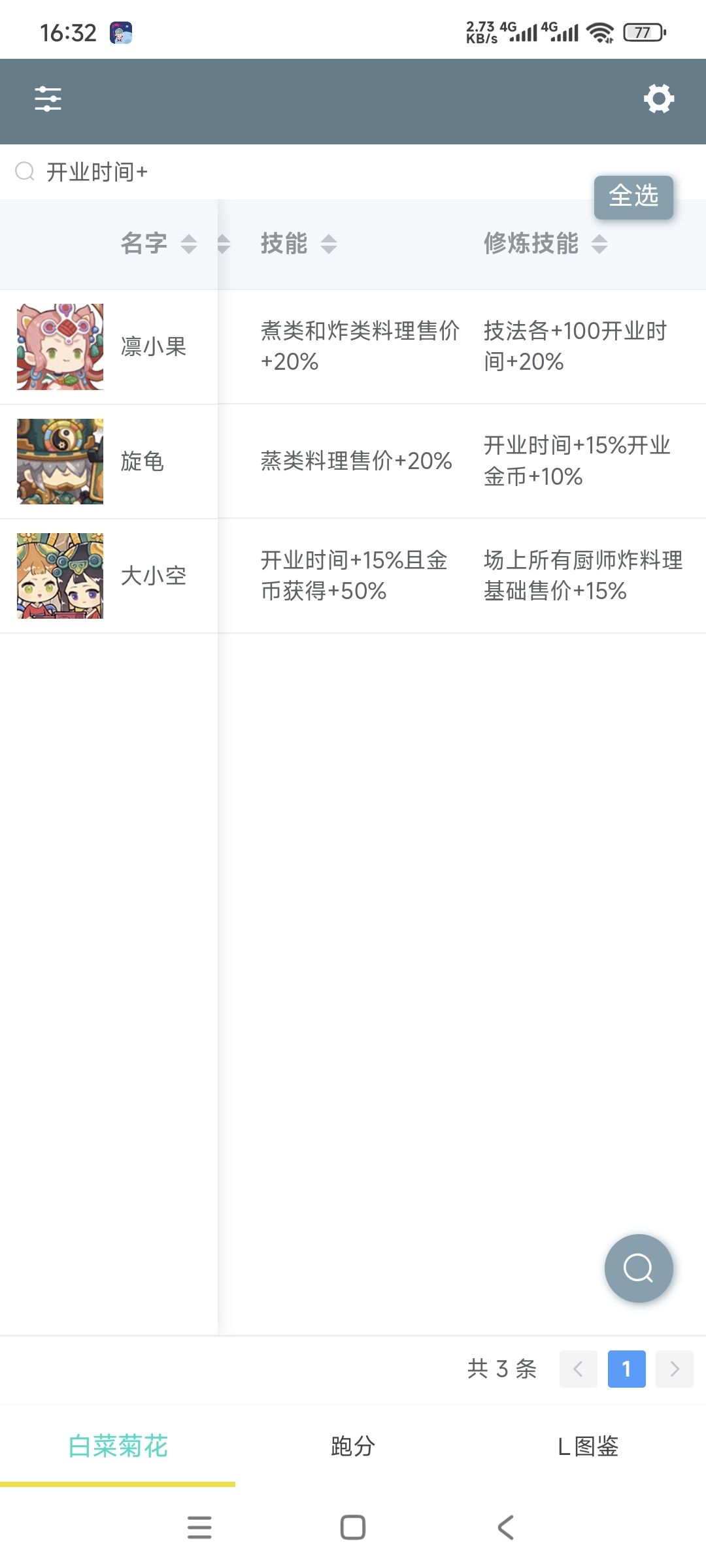 凛小果总技法不仅高,而且对开业时间比这两位多5%,刷专精更有益,同时修炼技能还有个“各技法+100”,因为本人没有凛小果,因此 图片技法应该为未修炼状态。