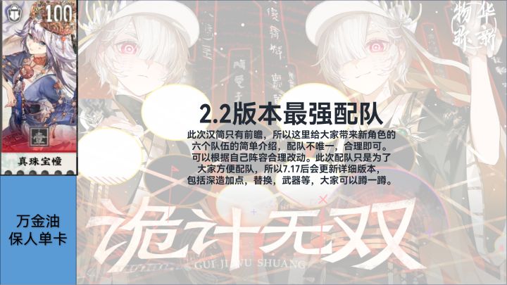 比其他配队略差,金瓯焕彰后应该会抬一手。主流玩法,输出爆炸,抗伤能力略低,高