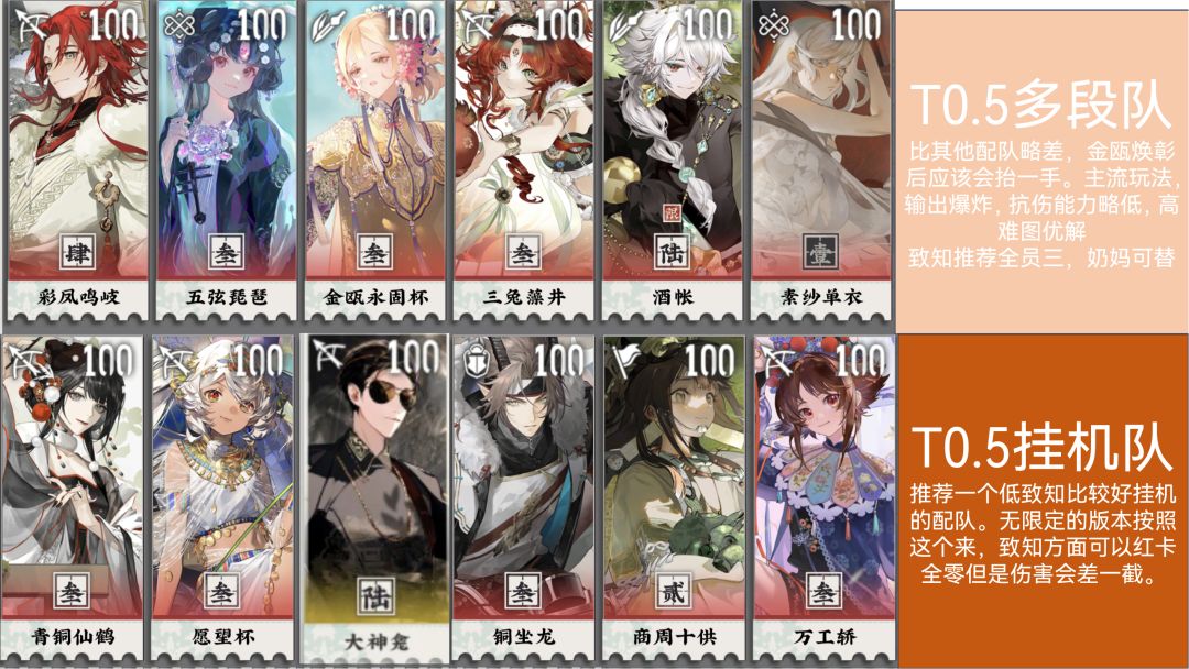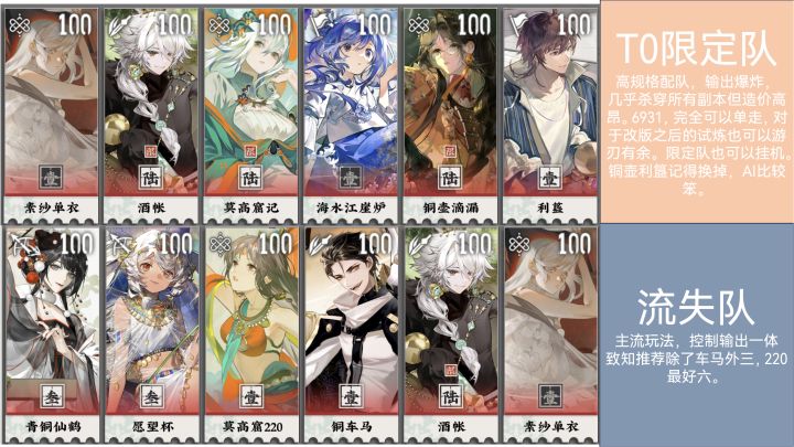 高规格配队,输出爆炸,几乎杀穿所有副本但造价高昂。6931(六致知酒帐3致知素纱单衣),完全可以单走,对于改版之后的试炼也可以游刃有余。限定队也可以挂机。铜壶利簋记得换掉,AI比较笨。