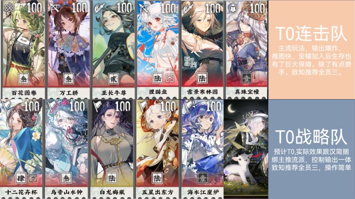 主流玩法,输出爆炸,推图快,宝幢加入后生存也有了巨大保障。除了有点费手。致知推荐全员三。很多图可以一回合速通。期待越王焕彰可以和连击碰碰。