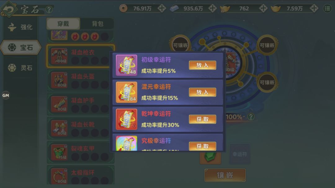 (4) 使用幸运符可提升宝石镶嵌成功率;不同幸运符提升概率不同。