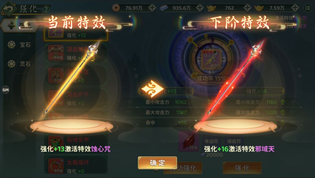 (5) 使用幸运符可提升强化成功率,不同幸运符提升的成功率不同;