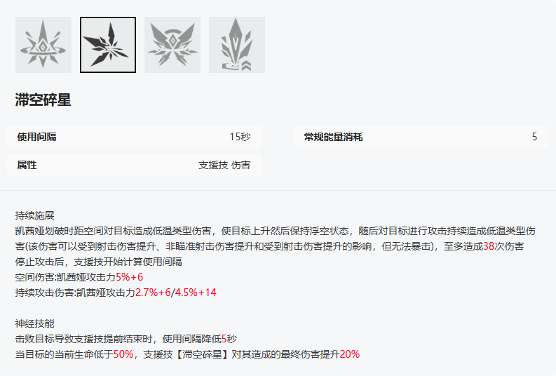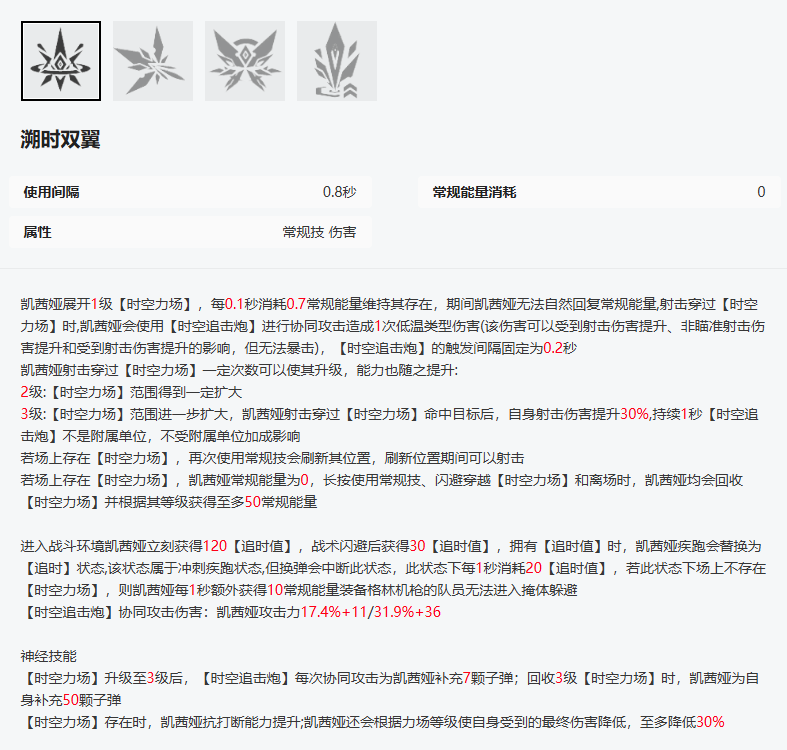 经典的小作文环节。第一部分为技能效果。使用后展开一扇门,子弹穿过后会触发炮台协同攻击,类似于水凯的炮台(炮台能吃射击伤害提升)。穿过门射击一段时间会强化门的效果,最后能提升射击伤害。门会持续到能量耗尽,长按常规技,闪避穿门以及离场,3级门回收完能回满能量,原则上属于没有cd也没有消耗。