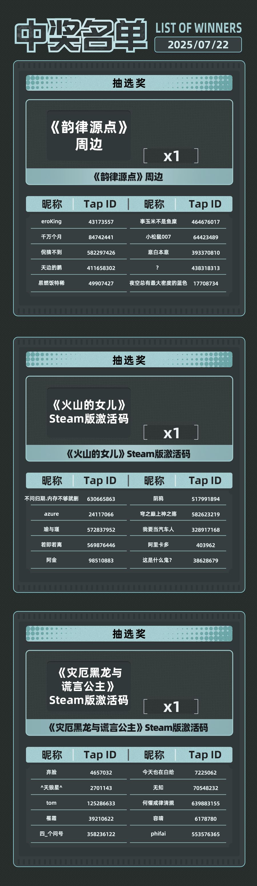 我们准备了《灾厄黑龙与谎言公主》和《火山的女儿》的Steam版激活码作为抽奖礼物,感兴趣的大家可以先在PC与它们共度时光;以及《韵律源点》的周边,在等待的过程中可以先摆上~