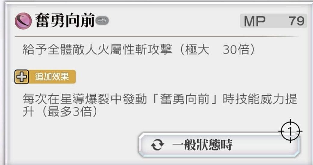 全体火斩(极大),根据此技能在星爆时使用次数威力提升(最多3倍)。