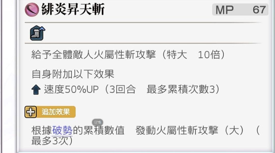 全体火斩(10倍特大),自身速度50%UP(可累积,上限3次/100%UP),根据【破势】累积数发动火斩(大),最多3次。