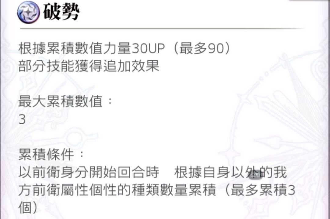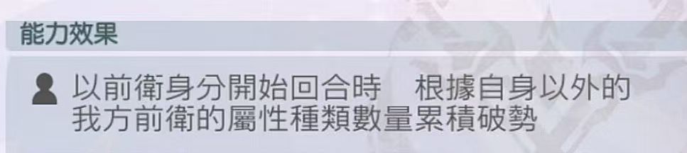 根据自身以外前排角色的属性个性的种类数累积【破势】,每珠提供自身30点力量,上限3珠/90点力量。