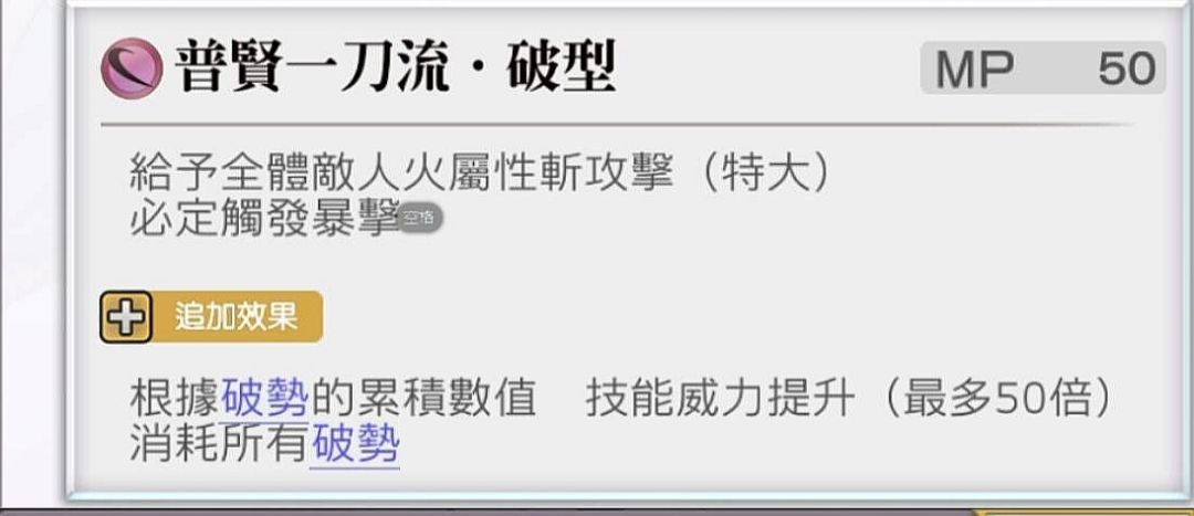 全体火斩(特大),必爆,消耗所有【破势】,根据消耗数提升威力(最大50倍)。