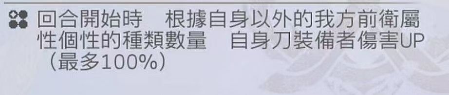 回合初根据自身以外前排角色的属性个性的种类数,自身当回合武器伤UP,最大100%。