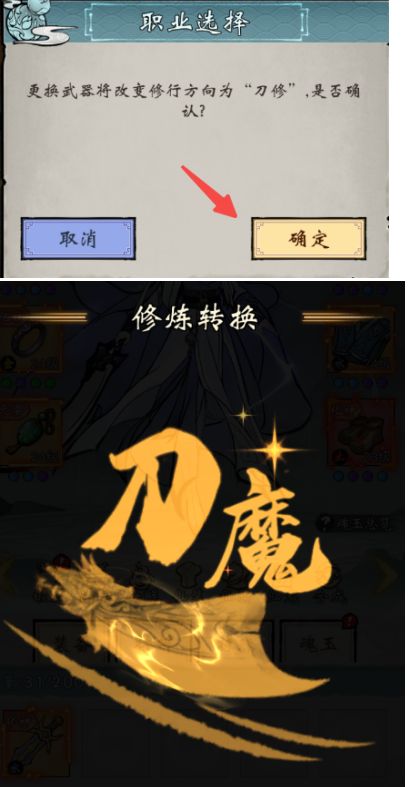 首先我们选择剑类武器装备,就会弹出职业选择的提示是否更换武器改变修仙方向,这里点击穿戴武器会弹出“职业选择”这个界面,玩家只需更换武器将会改变修行方向为“刀魔”。
