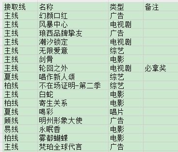 总结一下就是,主线和男主线加起来总共:1个唱片、3个电视剧、5个电影、4个广告、3个综艺。