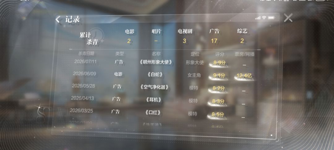 (本人亲测26年1月歌剧欣赏到五月,歌艺6k的数值接主题曲可以拿奖,直接进一代传奇线),此时寄生关系结束(建议存档),看一眼属性,基本上没走旧时光歌艺属性一般在2k。这时等喝彩接到手那段时间居家休息,喝彩结束继续降演技(我进喝彩线的时候歌艺刚好3千,基本都是不佳,没拿奖)。因为一个电影取给的演技最大值算900(全完美演技+30,总共30期,也就是加900点演技)。 我们接下来还有两部电影,预留差不多1800就够了,不够继续降,或者考虑放弃最后一个电影。(如果放弃最后一个电影,选钱的时候选第一个,先把钱拿到手再说),演电影和电视剧的时候把体力拉到必须休息再休息,这样可以高概率不完美,少加点演技。一直维持到12月,12月开始出去接通告,有啥接啥,反正1月结束之后不算违约,能接的都接了,把钱拿到手。其中比较快的广告和唱片可以考虑先做了,再拿点钱。这样基本上都是稳拿化身资本线。