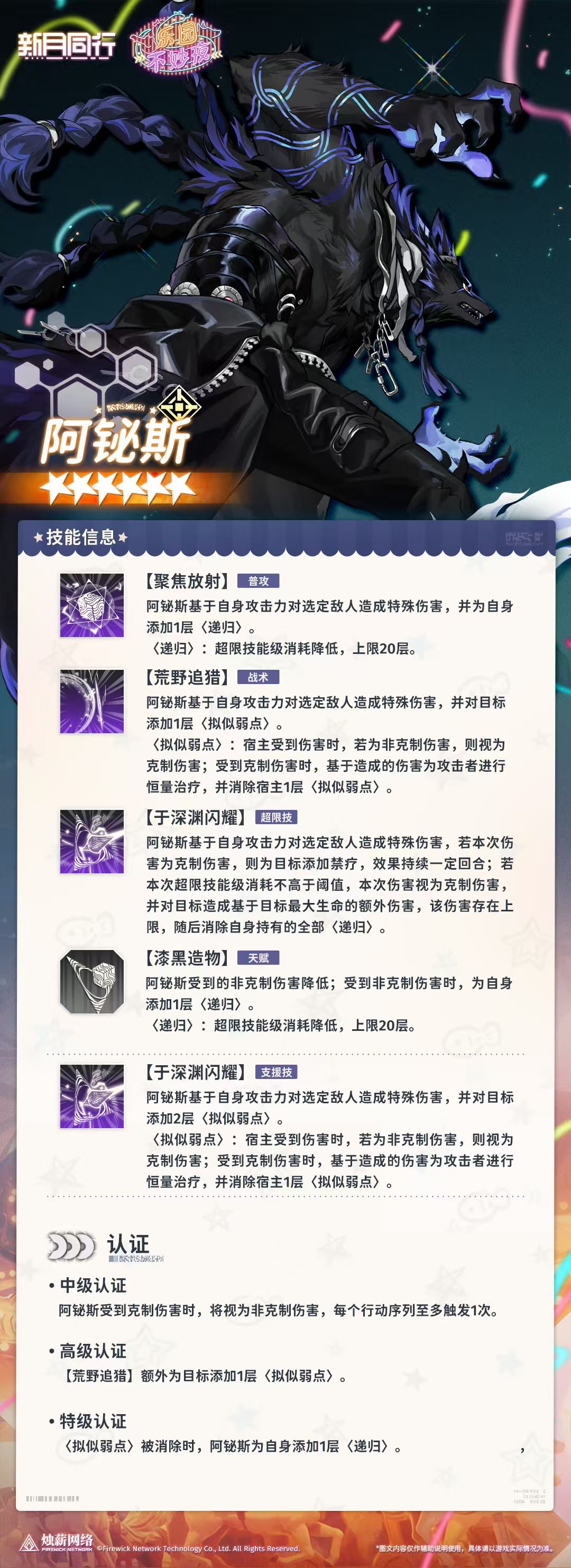技能组有点抽象,禁疗只给大招,持续两回合,大招能耗高,感觉做常规对策不是很理想,还是棍子哥20能耗减疗好用点,其次这个百分比伤害有点抽象,以攻击力为基础。目前放哪都不是很有位置,强度都给立绘了,粉球也不吃。还是能耗有点高了,感觉大招给到70就能耗就好玩多了。