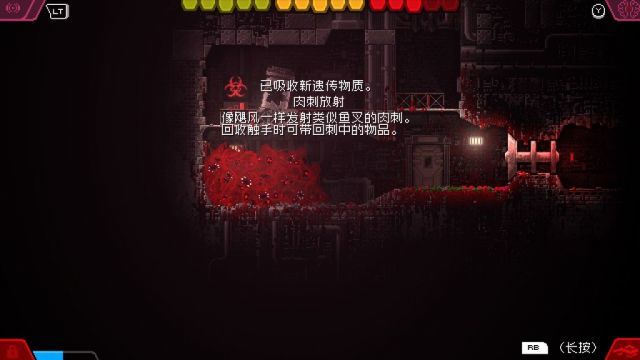 那么就会出现一个问题是:在特定的场景可能会出现形态不对或者没电使用特殊能力的情况,针对这一点游戏中设计了红色的水池可以“存放生物质”,功效为以5位单位扣除血量,在水中留下一个红球,结合存档点的存档回血,基本就可以实现形态的自由转换来应对游戏中的各类场景。