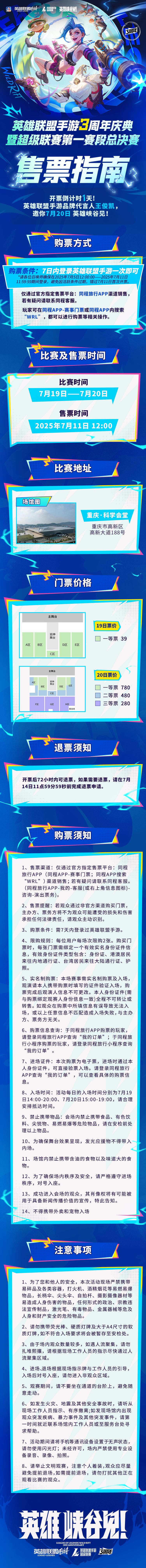 《英雄联盟手游》3周年庆典暨超级联赛第一赛段总决赛门票开票倒计时1天!7月11日(明日)中午12:00正式对外开启7月19日、7月20日的门票售卖!和隆哥一起在重庆市科学会堂见证这荣耀的时刻吧~