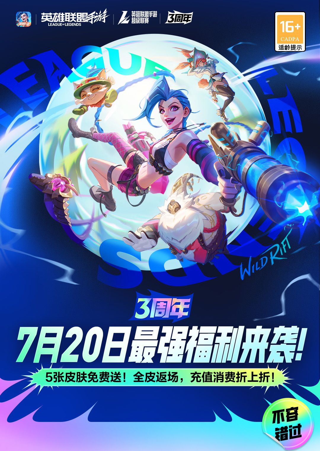 全体目光向隆哥看齐,最强福利即将来袭!7月20日,《英雄联盟手游》3周年福利狂欢盛大开启,5+6款皮肤、首发“臻宝”品级皮肤免费薅!还有皮肤首次全返场,充值消费折上折!还在等什么,快点击下方图片,提前一饱眼福吧~