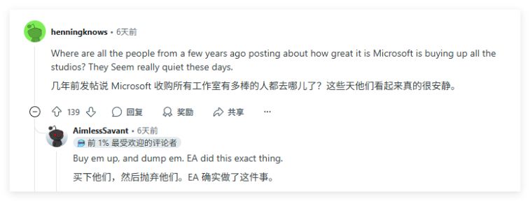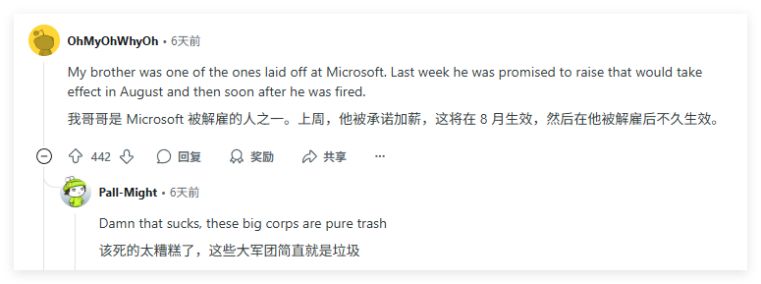 而在reddite上关于微软裁员通告的帖子也冲上了热门,有路人玩家回帖称上周被承诺加薪,而随后就被微软解雇。民众显然对9000人的失业及游戏工作室的动荡感到悲伤。