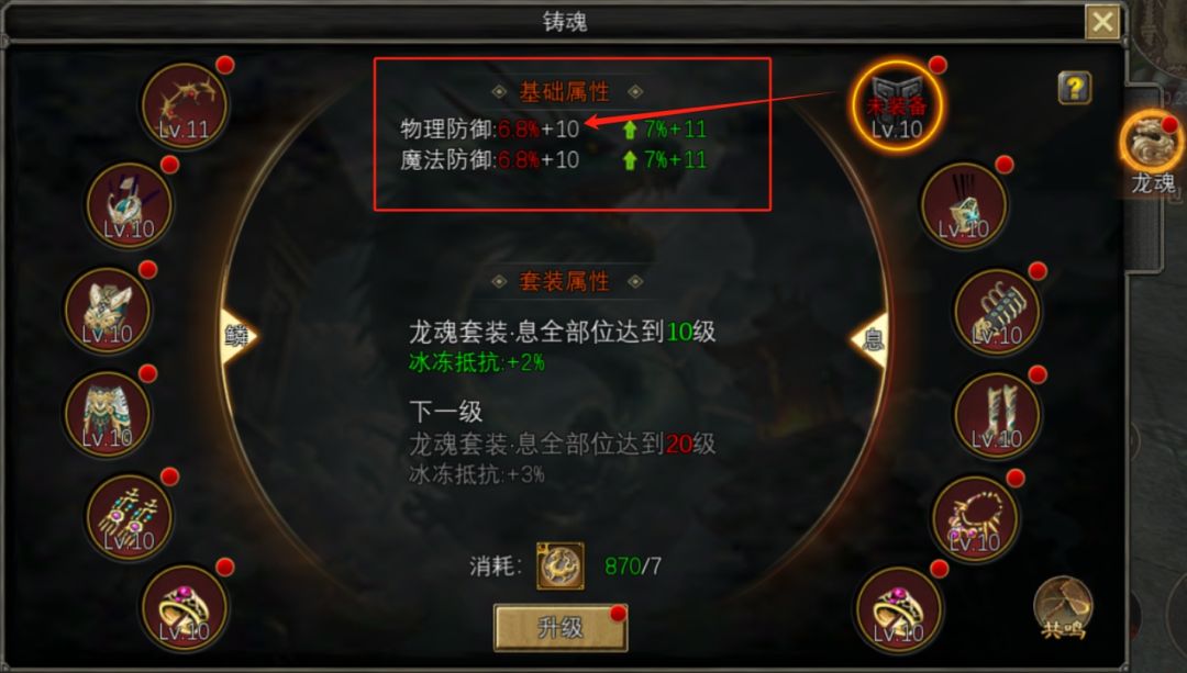 最让人兴奋的是铸魂共鸣!当铸魂的所有部位都达到指定等级时,共鸣属性会被华丽地激活!共鸣激活之后,会增加所有铸魂部位的%加成属性,随着龙魂等级提升,共鸣提供的百分比值成长更高!目前最高开放龙魂100级共鸣,不知道哪位大佬可以率先达到~