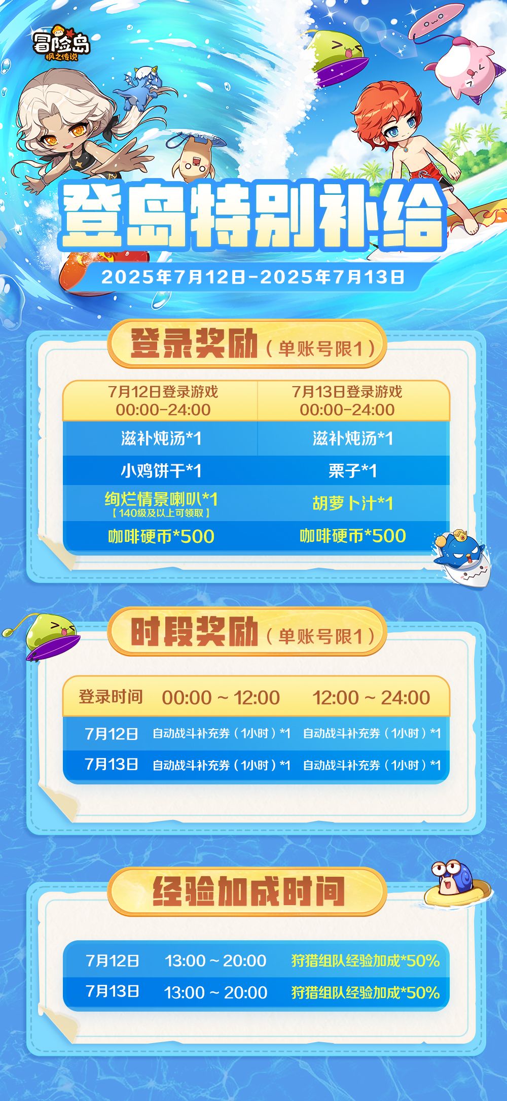 五转V2版本已正式上线,小喵为大家准备了周末特别补给加持!7月12日-7月13日登录游戏即可领取咖啡硬币及特别加送道具,狩猎组队经验加成也将同步提升至50%,冒险家可千万不要错过~