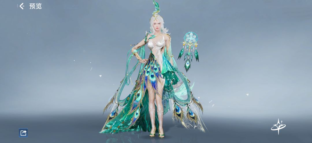 女款似仙子降临,以纯净白为底,搭配清新蓝绿,裙身缀满绚丽孔雀羽毛。头饰配饰精巧呼应,羽毛装饰物件悬浮在身侧,贴合身形的剪裁勾勒柔美曲线,薄纱与金属装饰交融,轻盈又精致,谁看了不说一句绝美!